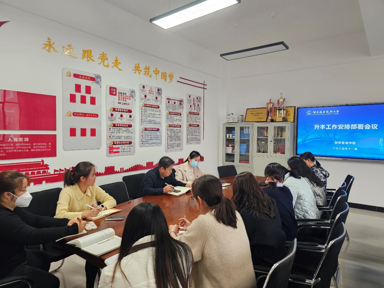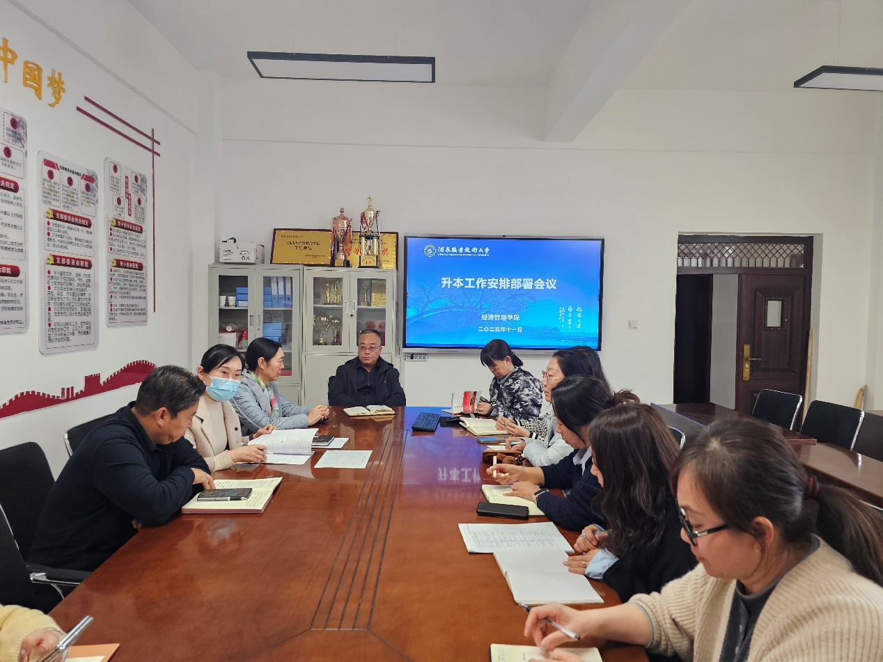 职业本科办学是学院提升办学层次、培养高素质技术技能人才的关键一步,也是服务区域经济发展的重要举措。为稳步推进专业升本申报工作,规范任务流程、明确责任要求,11月7日下午,经济管理学院在经世楼一楼会议室召开升本工作安排部署会议。学院院长张晓彬及升本工作小组全体成员参会,会议由副院长杜静主持召开。