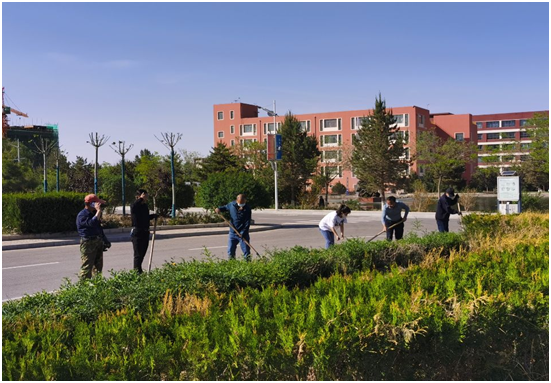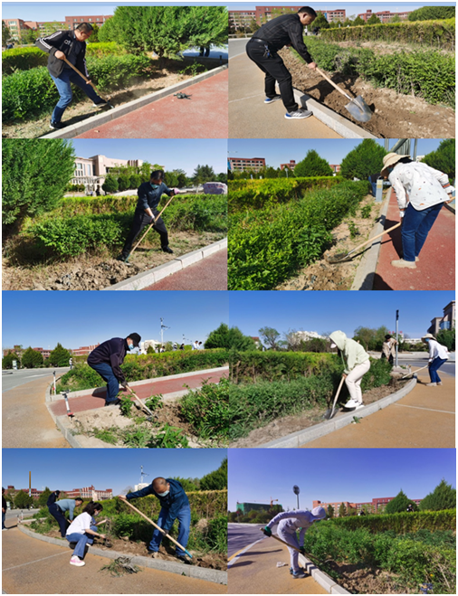 活动中,同志们到校园中心花坛,按照校园绿化人员的指导,相互合作、齐心协力,翻土整地、铲除杂草、覆膜掩土、捡拾垃圾。尽管烈日当空,室外温度高达30多度,但同志们热情不减、干劲十足,大汗淋漓,全力以赴圆满完成了劳动任务。
